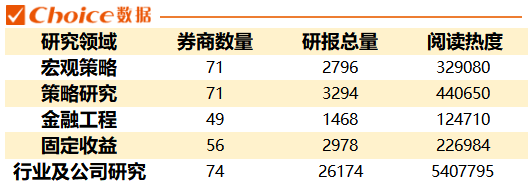 研究细分领域上,宏观研究、策略研究、金融工程、固定收益、行业及公司研究5个研究领域的整体情况如下: