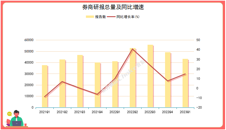 按季度来看,2023年一季度研报产出数量较2022年四季度有所下降,但较去年同期同比增长14.79%。