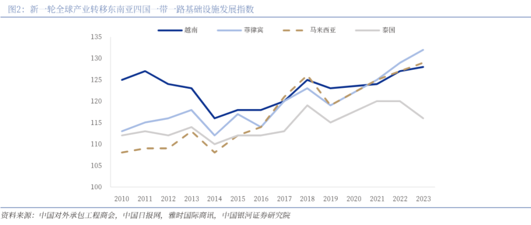 新一轮全球产业转移启动,东南亚成为最大受益区域。越南、菲律宾、马来西亚、泰国的基础设施发展指数整体呈上升趋势,市场空间潜力较大。