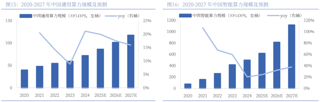 智能算力增长推动数据中心建设需求,2024年中国智能算力规模497.1EFLOPS,到2027年将达1117.4EFLOPS,年复合增长率31.0%,增速远超通用算力。