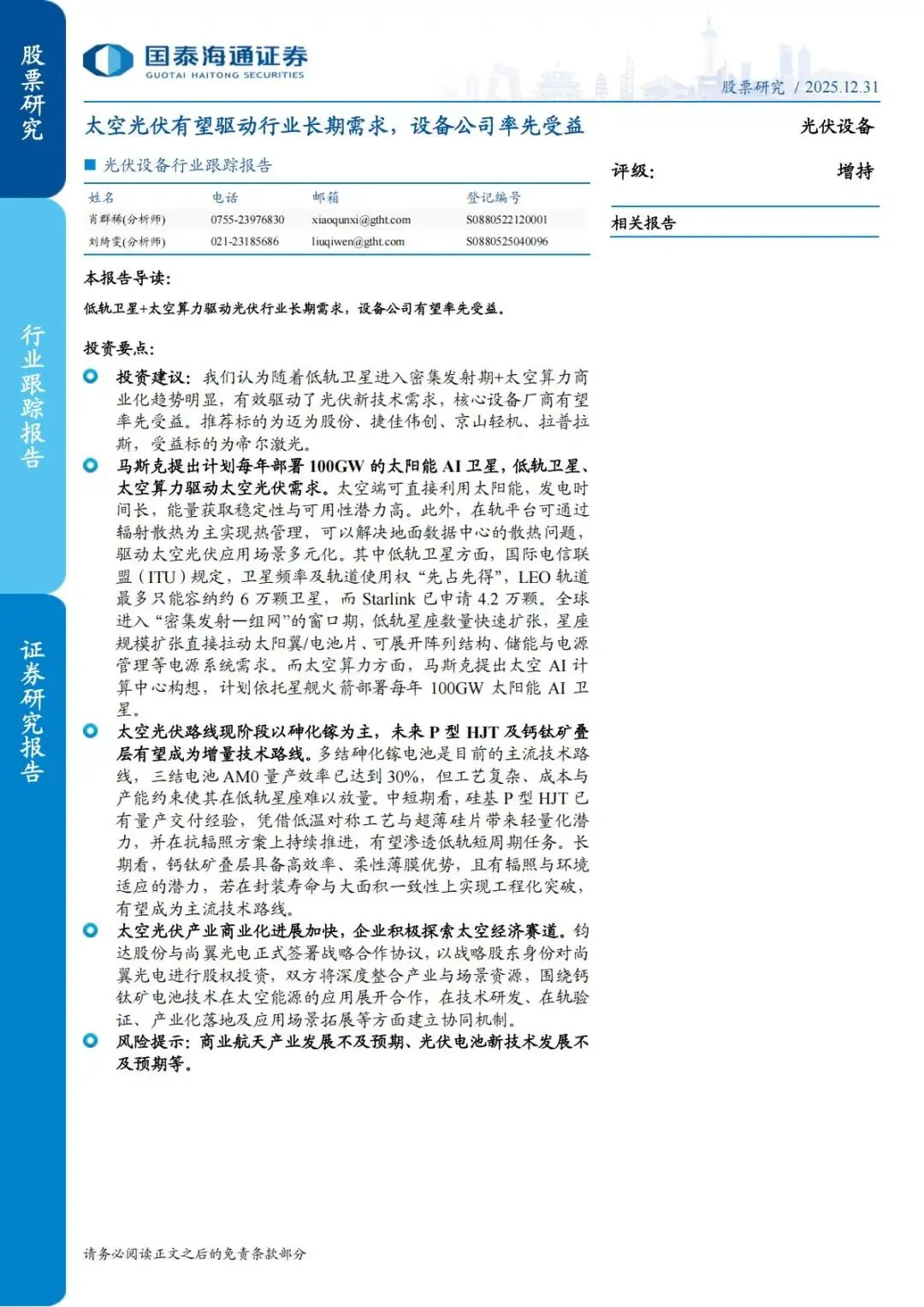 『研报』光伏设备行业跟踪报告:太空光伏有望驱动行业长期需求,设备公司率先受益