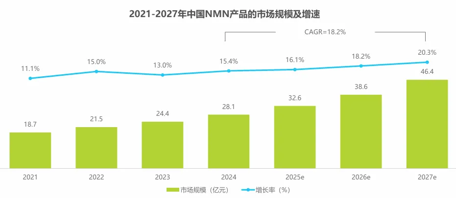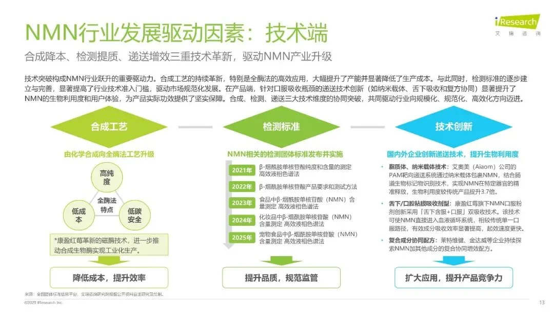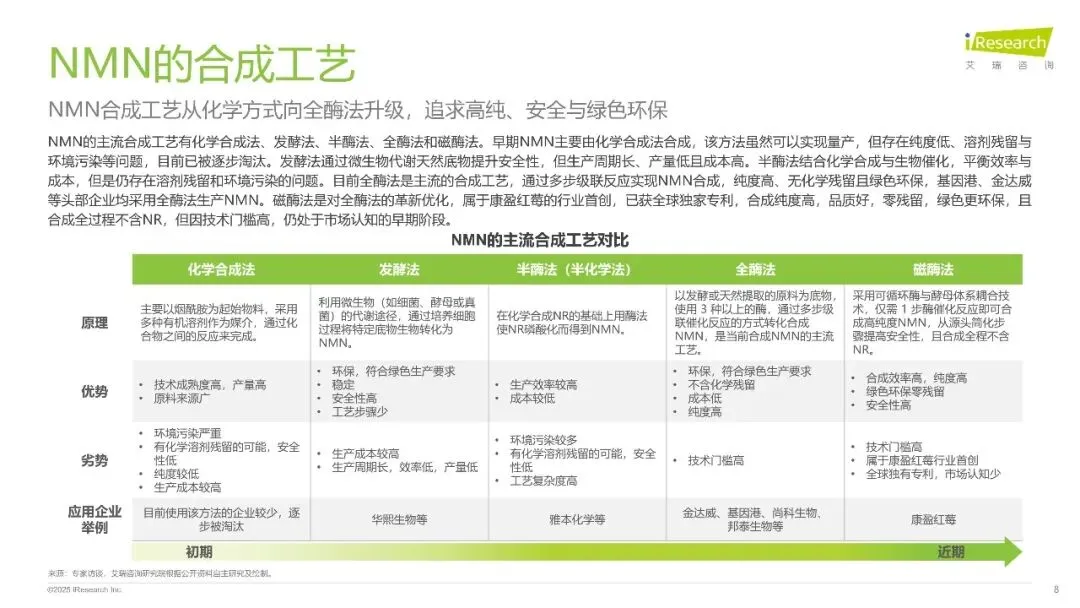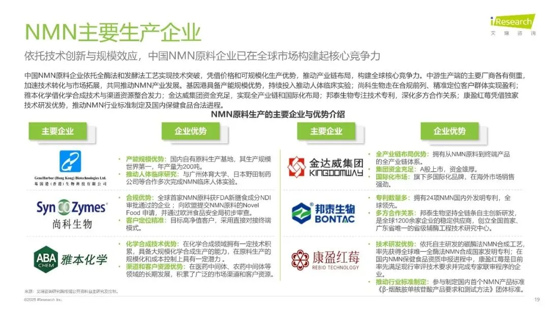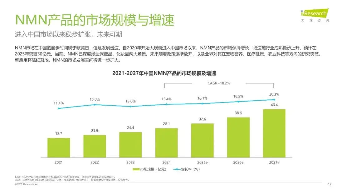 当前,中国已成为全球最大的NMN原料生产国。以基因港、金达威、康盈红莓等为代表的头部企业,通过全酶法等先进合成工艺不断提升产能和纯度,构建了技术壁垒。2025年,中国NMN产品市场规模预计突破30亿元,增长迅速。