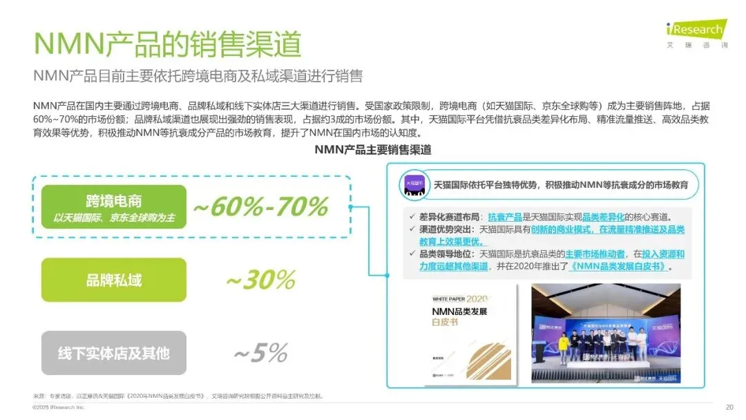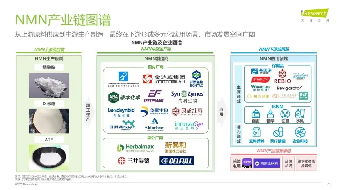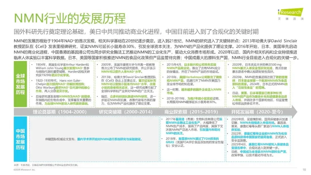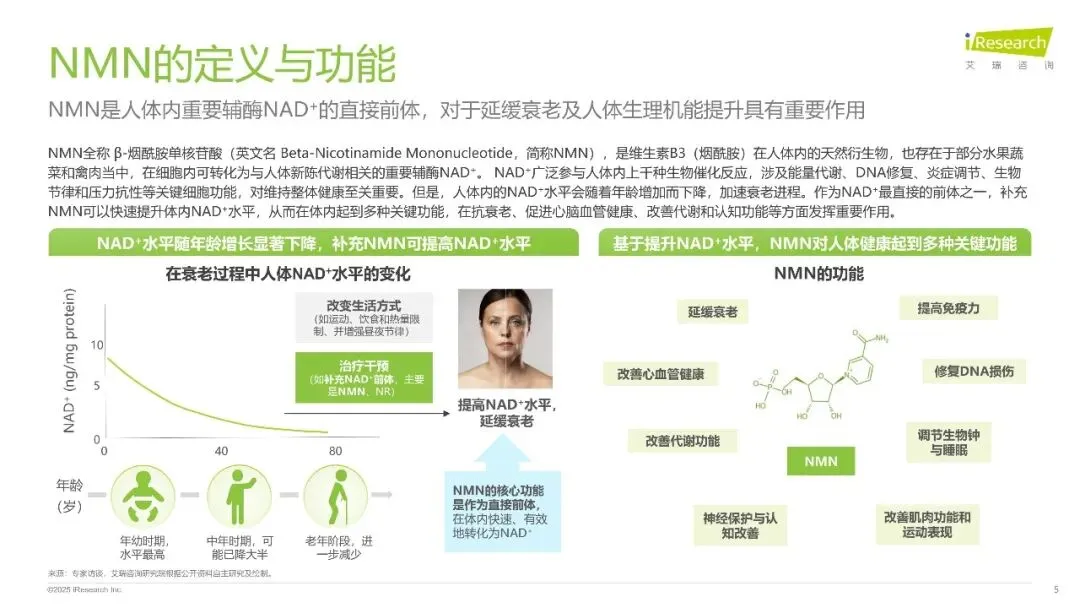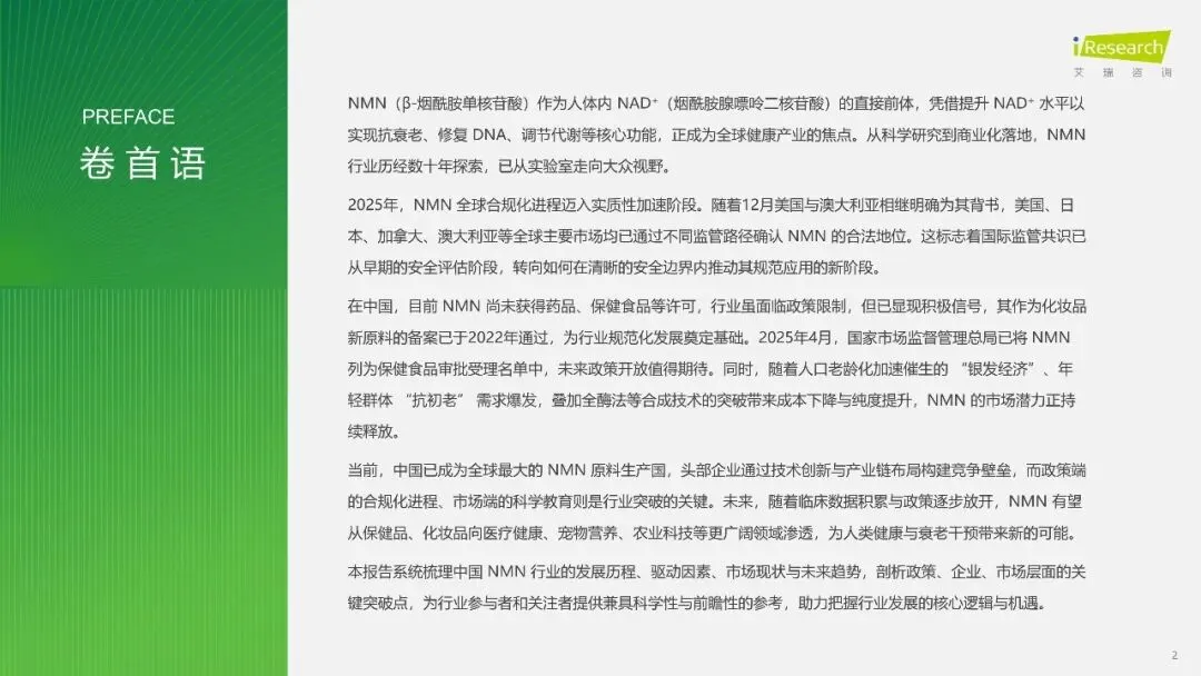 ☝扫码加入会员,海量优质报告下载无限制。报告每日更新,覆盖各行业,查找起来省时省力~⭕关注公众号并回复“营销资料”,可免费获取新人资源礼包1份!近年来,一种名为NMN(β-烟酰胺单核苷酸)的物质逐渐走进大众视野。它被誉为“抗衰老成分”,实际上是我们人体内重要辅酶NAD+的直接前体,能够帮助提升NAD+水平,从而在延缓衰老、改善代谢、保护心血管等方面发挥作用。2025年,中国NMN行业正处在一个关键的发展节点。虽然目前NMN在国内尚未获得药品或保健食品的正式许可,但政策已释放积极信号。2022年,NMN已通过化妆品新原料备案;2025年4月,更被列入保健食品审批受理名单,行业合规化进程稳步推进。