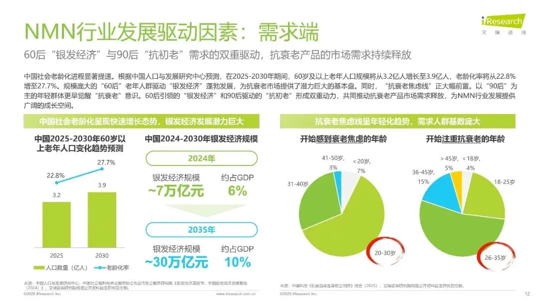 市场需求的增长主要来自两方面:一是人口老龄化加速,“60后”群体推动“银发经济”崛起;二是年轻一代如“90后”的“抗初老”意识增强,共同带动抗衰老产品消费。