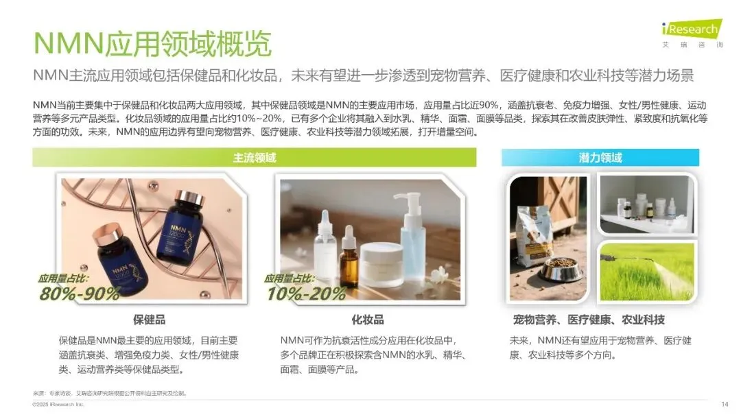 目前,NMN主要应用于保健品和化妆品两大领域。保健品占比近90%,产品形态包括胶囊、片剂、粉剂等,并衍生出女性健康、运动营养等细分场景;化妆品方面,NMN已成为国内备案数量最多的化妆品新原料,多家企业已推出相关护肤产品。