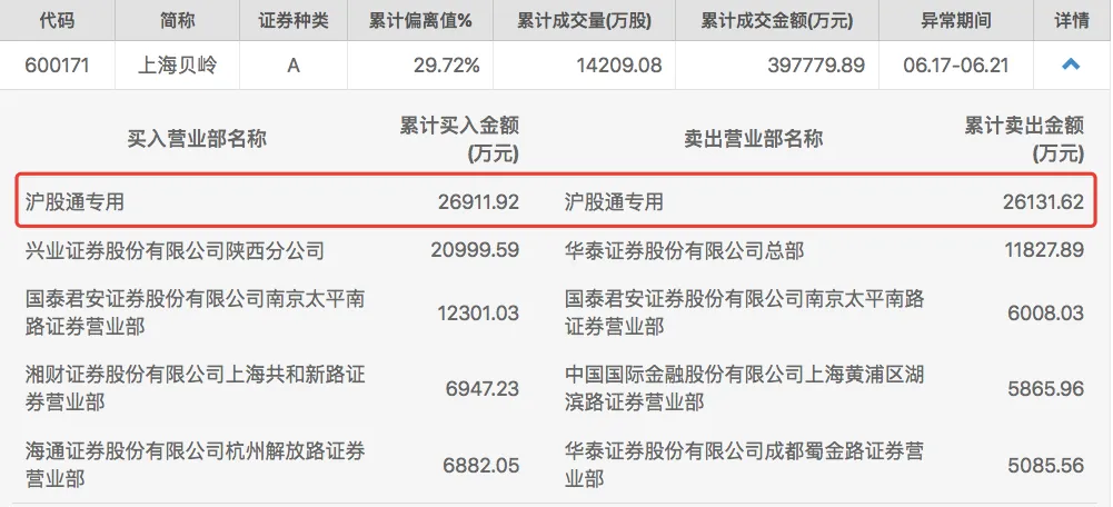 盘后,上交所发布的公开交易数据显示,6月17日至21日期间,沪股通大举买入上海贝岭2.69亿元,同时又卖出2.61亿元,兴业证券陕西分公司累计买入约2.1亿元,华泰证券总部卖出1.18亿元。