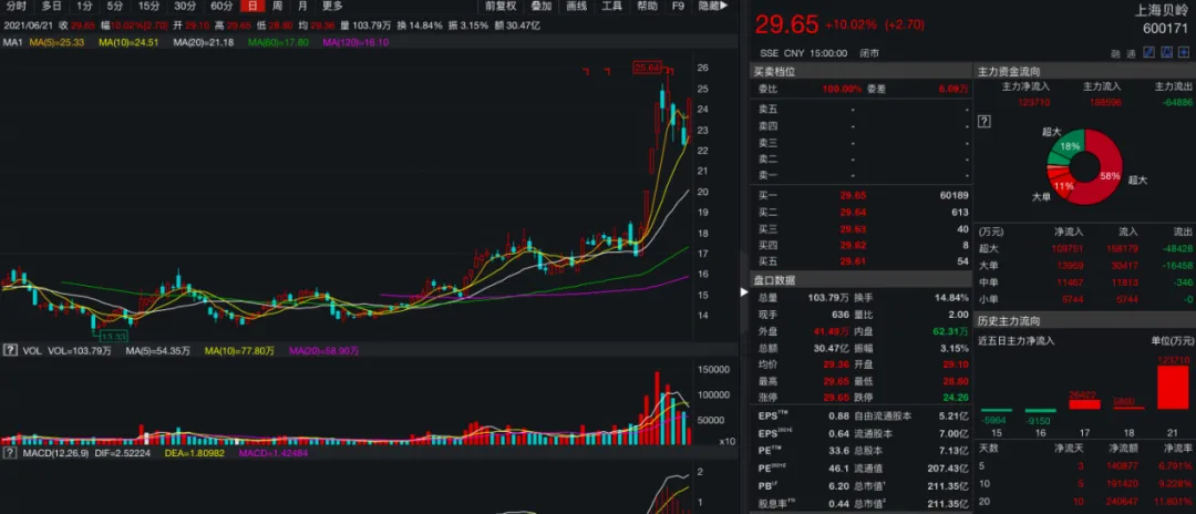 6月21日,上海贝岭在前两个交易日涨停基础上再次涨停,斩获三连板,最新股价报收29.65元/股,全天换手率14.84%,成交额超过30亿元。