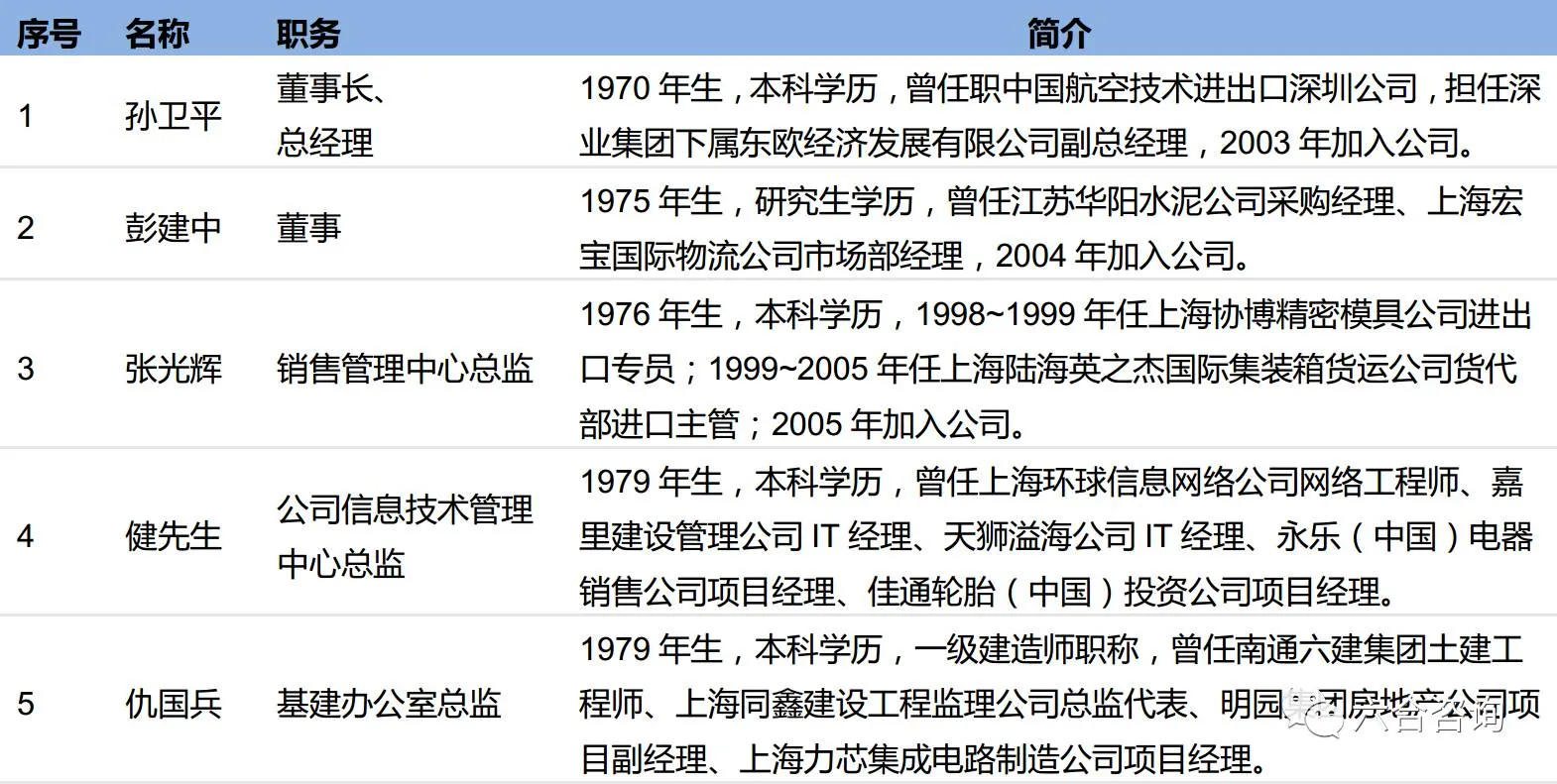 公司核心管理人员有丰富进出口、物流、IT、基建等供应链管理细分领域从业经验,职能互补,彼此促进。公司董事长、总经理孙卫平,曾任职中国航空技术进出口深圳公司,任东欧经济发展有限公司副总经理;董事、运营管理中心总监彭建中,曾任职海宏宝国际物流公司;销售管理中心总监张光辉,曾就职于上海协博精密模具公司、上海陆海英之杰国际集装箱货运公司,负责进出口工作。