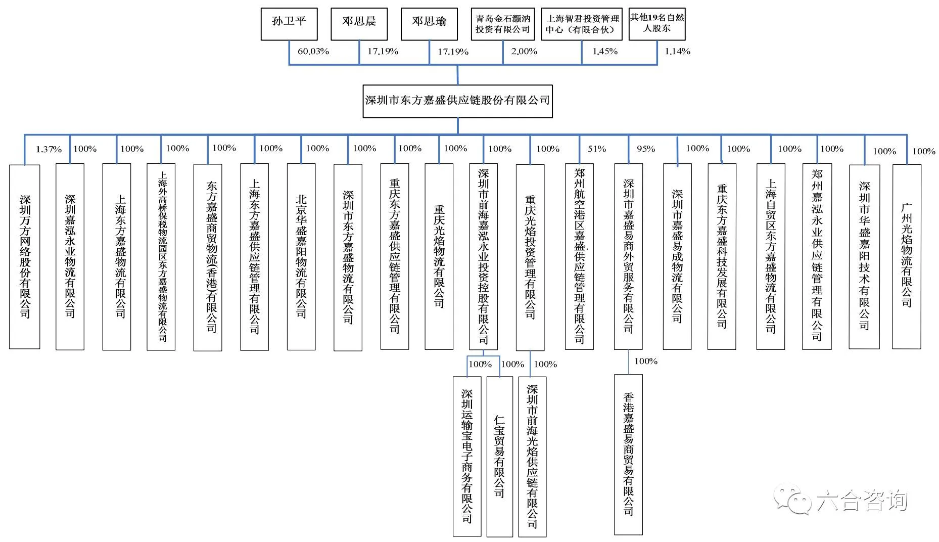 公司2001年成立,前身为东方嘉盛商贸物流公司,有23家控股公司、1家参股公司,总股本1.04亿股。董事长、总经理孙卫平,直接持有公司6,368万股(占61.5%),通过上海智君间接控制公司1.4%股份;其子女邓思晨、邓思瑜合计持有公司3,560万股(占34.4%),但因邓思晨、邓思瑜均未成年,其享有股东权利由其法定监护人孙卫平代为行使,孙卫平合计控制公司97.3%股份,为公司控股股东、实际控制人。