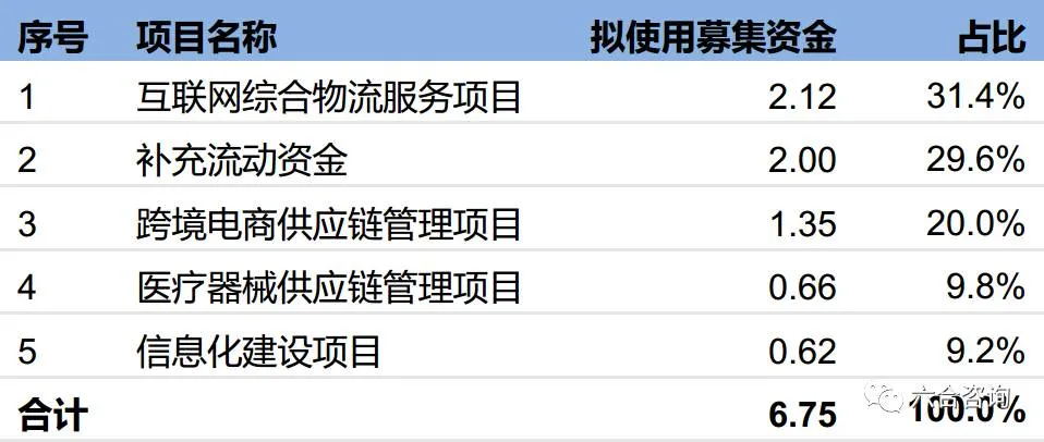 公司即将登陆深交所IPO,发行不超过3,453万股,募集6.75亿元,主要用于:1、互联网综合物流服务项目,拟投资2.12亿;2、补充流动资金,拟投资2.00亿;3、跨境电商供应链项目,拟投资1.35亿;4、医疗器械供应链管理项目,拟投资0.66亿;5、信息化建设项目,拟投资0.62亿。