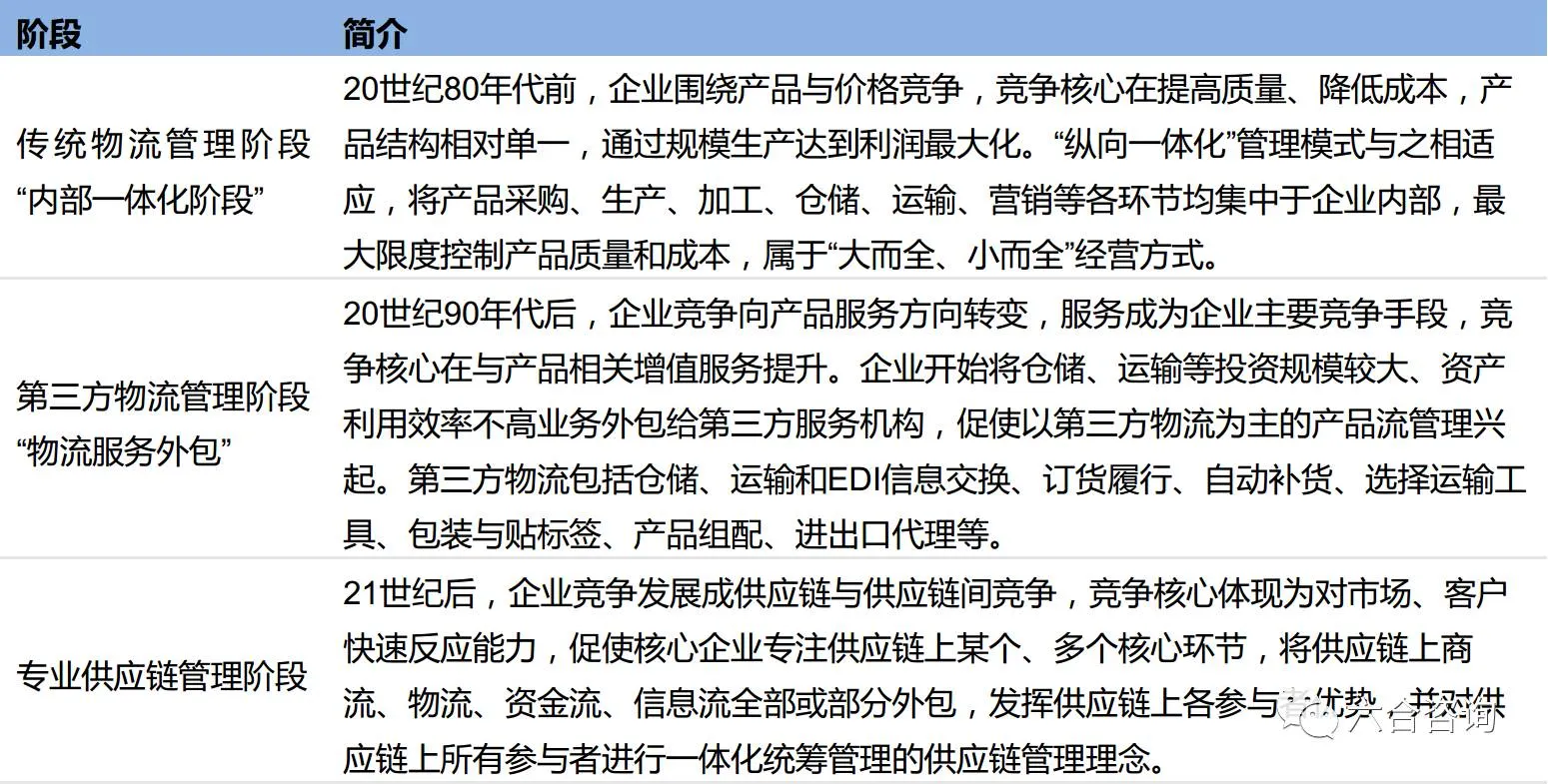国际分工深化,跨国企业发展,推动供应链管理产生与发展。国际生产经营活动日益精细化、专业化、规模化,跨国企业为提高运作效率,多采取聚焦策略,强化自身核心竞争力,推动物流管理历经内部一体化、物流外包、专业供应链管理3阶段。