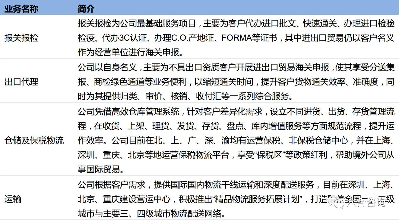 基于报关报检等4项基础服务,形成基础+深度整合供应链管理2大稳固业务模式