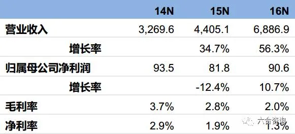 毛利率:2014~2016年分别为3.7%、2.8%、2.0%。