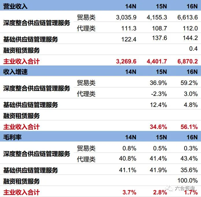 深度整合供应链管理服务(贸易类):公司营收主要来源,采取买断式销售商品,净利率较低。2014~2016年该业务收入分别为30.4亿、41.6亿(+36.9%)、66.1亿(+59.2%),毛利率分别为0.8%、0.5%、0.3%。