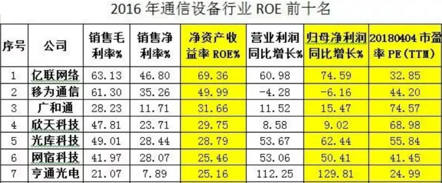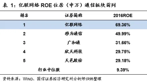 2016年亿联网络的ROE高达69%,在通信设备行业中排名第一。