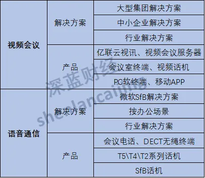 公司主要提供视频会议和语音通信领域的解决方案和终端产品,具体如下表: