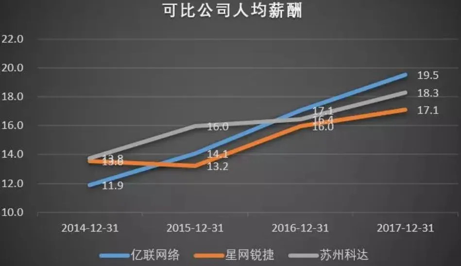 上图清晰的说明,截至2017年底,亿联网络的人均利润高达86.1万元,差不多是国内可比上市公司星网锐捷与苏州科达的10倍!人均利润这么高,那么公司分给员工的薪酬理应水涨船高,然而薪酬水平却与同行相差无几。