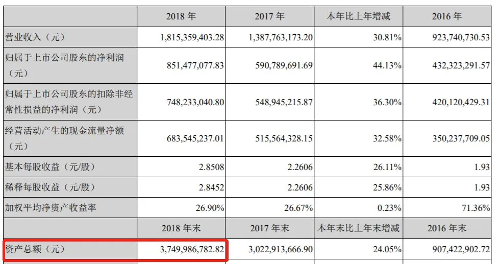 2018年,公司实现营业收入18.15亿元,增幅30.81%,实现归母净利润8.51亿元,增幅44.13%。这已经是该公司连续四年保持营业收入及利润30%以上的高速增长。