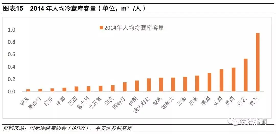 我国冷链物流行业整体实力还比较弱,冷链基础设施设备结构不平衡,与发达国家相比还有较大的差距。据统计,2014年人均冷库体积是0.06 立方米/人,同期美国是0.36立方米/人,2017年,全国人均拥有量占美国的1/4,占日本的1/3。