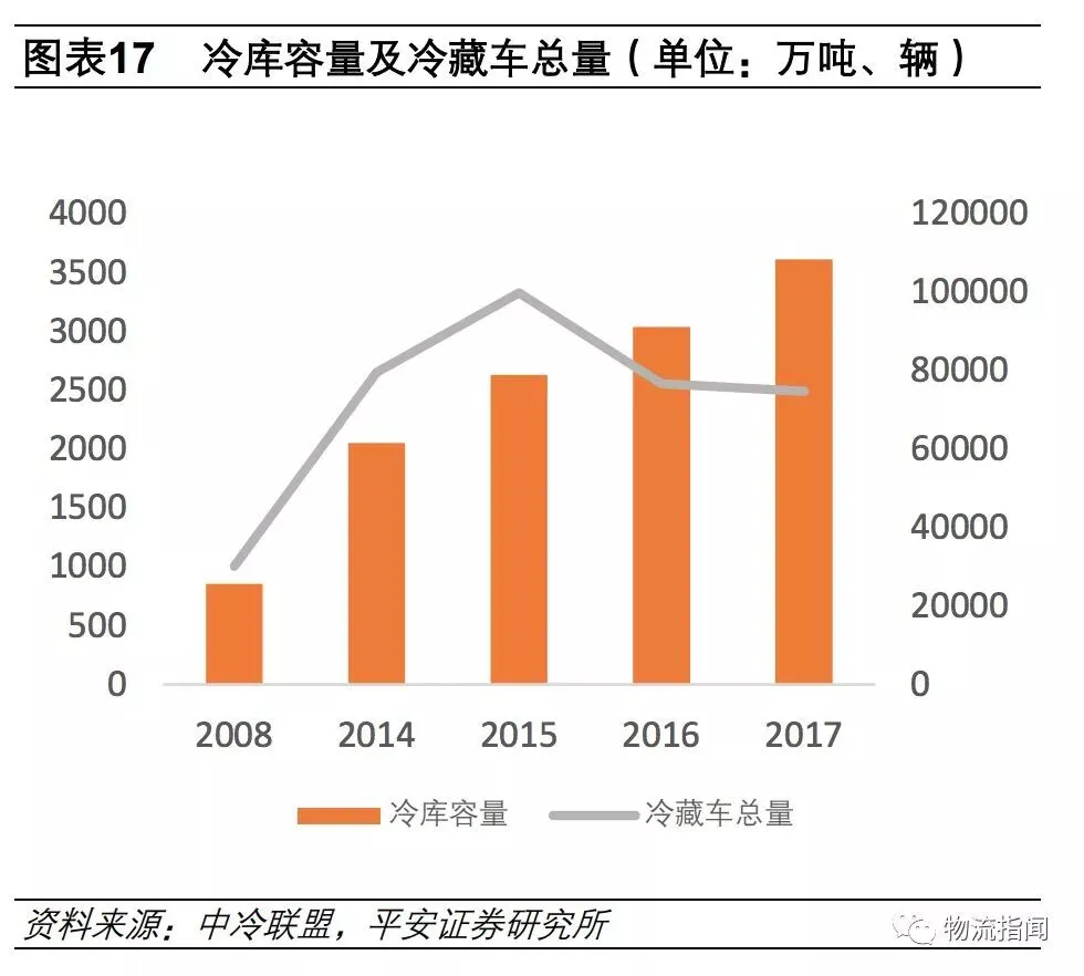 据中冷联盟发布的2017版《全国冷链物流企业分布图》数据显示:2017年中国冷库总容量为3610万吨,冷藏车保有量为74637辆,其中自有冷藏车为31643 辆,企业整合社会冷藏车42994辆。相比较2016年的 3035万吨,冷库总容量增长18.9%;相比较2016年冷藏车保有量为76527辆,冷藏车总量减少2.5%;其中自有冷藏车总量减少16.3%,社会冷藏车增加11.6%。