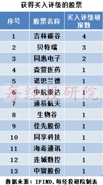 吉林碳谷、贝特瑞、同惠电子、海希通讯、佳先股份、连城数控、诺思兰德、生物谷、通易航天、同享科技、中航泰达、中寰股份、森萱医药等股票获得了“买入”评级。每经投研院统计,获得“买入”评级的公司,自北交所开市以来截至1月13日,其平均涨幅为8.15%,较北交所全部股票的平均跌幅16.97%高25.12个百分点;剔除涨跌幅最大的股票后,其平均跌幅为8.96%,较北交所全部股票的平均跌幅16.97%高8.01个百分点。自北交所开市以来,截至1月13日,申万宏源的刘靖、安信证券的诸海滨对北交所个股关注度较高,分别发布了4篇北交所公司研报,中信证券的王喆发布了3篇北交所公司研报。
