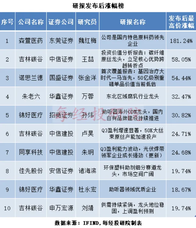 自北交所开市以来,截至1月13日,研报发布后个股涨幅最大的为东莞证券的魏红梅,该研究员于2021年11月22日发布森萱医药的研报《公司是国内特色原料药领先企业》后,该股最高价较研报发布日的收盘价上涨了181.24%;其次为中信证券王喆,该研究员于2021年11月19日发布吉林碳谷的研报《政策发力稳增长,碳排放双控催生长期机遇》后,该股最高价较发布日的收盘价上涨了58.05%;国盛证券的张金洋于2021年12月11日发布诺思兰德的研报后,该股最高价较发布日收盘价上涨了54.44%。值得注意的是,研报涨幅榜榜首的魏红梅所在券商为东莞证券,是一家注册资本仅15亿元的小型券商,较其他头部券商综合实力相差较大。其他研究员如万蓉、孙炜、卢昊、朱玥、诸海滨、杜永宏、刘靖等发布相应个股研报后,个股最高价的涨幅也居前。