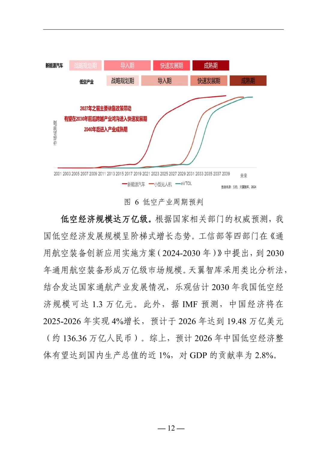 核心依据来自产业周期与政策技术支撑。参考新能源车发展规律,低空经济当前处于导入期中期,预计2027年政策退出后进入市场化筛选,2030年跨进爆发期。政策上国家完善空域规则,地方密集布局基建;技术上eVTOL的氢燃料电池动力、低空通导的5G-A与北斗三号技术逐步成熟。规模上乐观估计达1.3万亿元,对GDP的贡献率将达2.8%,成为经济增长新引擎。