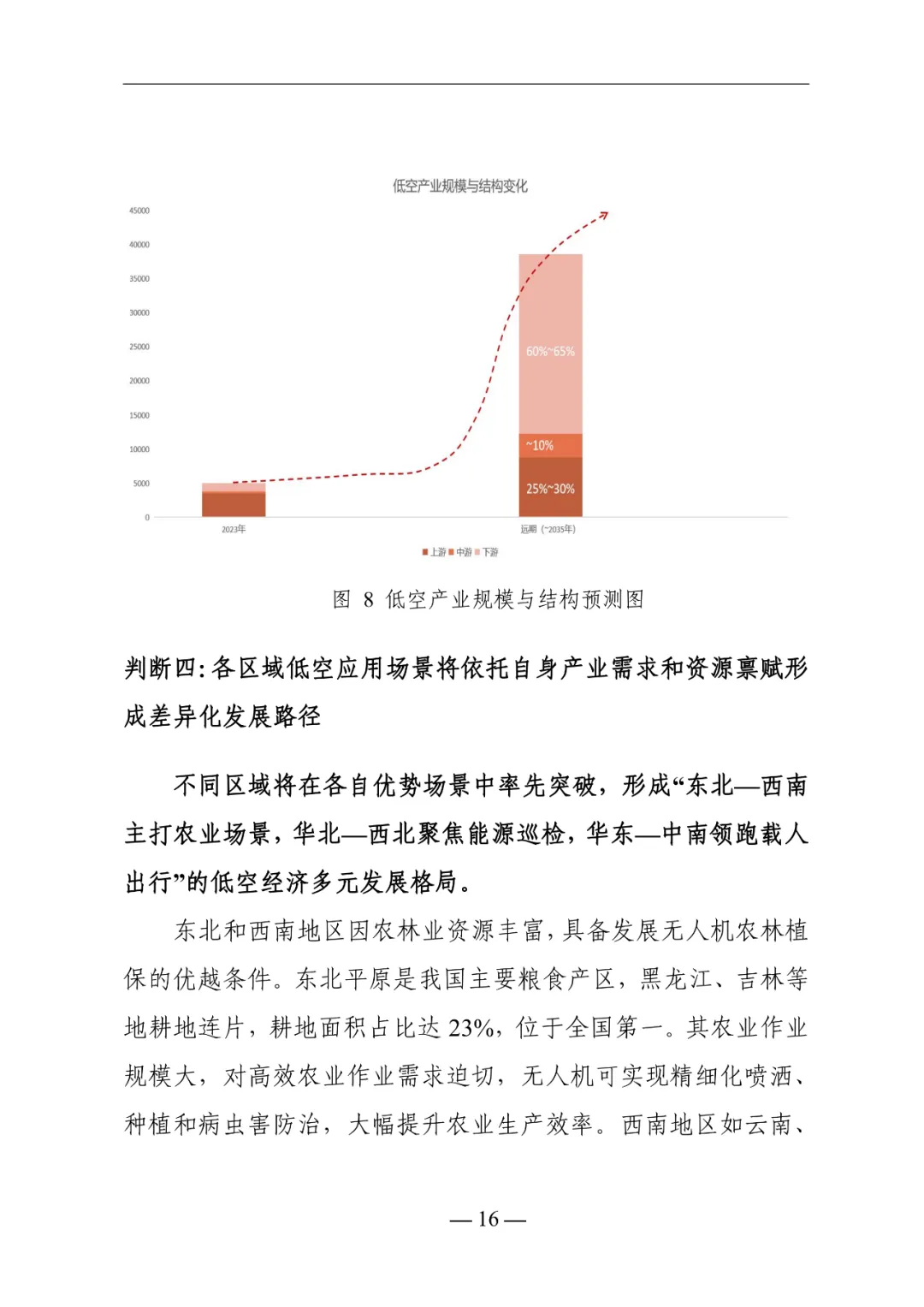 报告认为会按资源禀赋形成差异化路径。东北-西南主打农林植保,东北耕地占全国23%,农业作业规模大;西南林地占29.35%,复杂地形适配无人机作业。华北-西北聚焦能源巡检,新疆等四省油气管道占全国20%,河北等五省输电线路占25%,无人机可替代人工。华东-中南领跑载人出行与文旅,长三角、珠三角通勤压力大,深圳已试运行跨城eVTOL航线,单程仅20分钟。