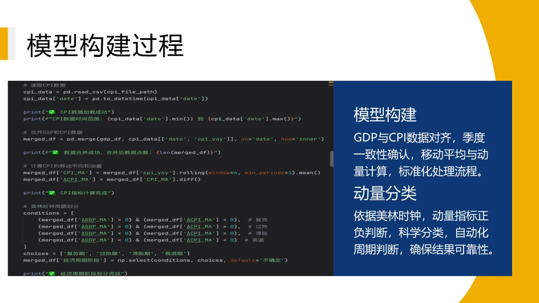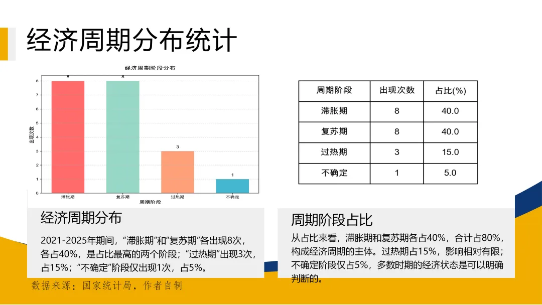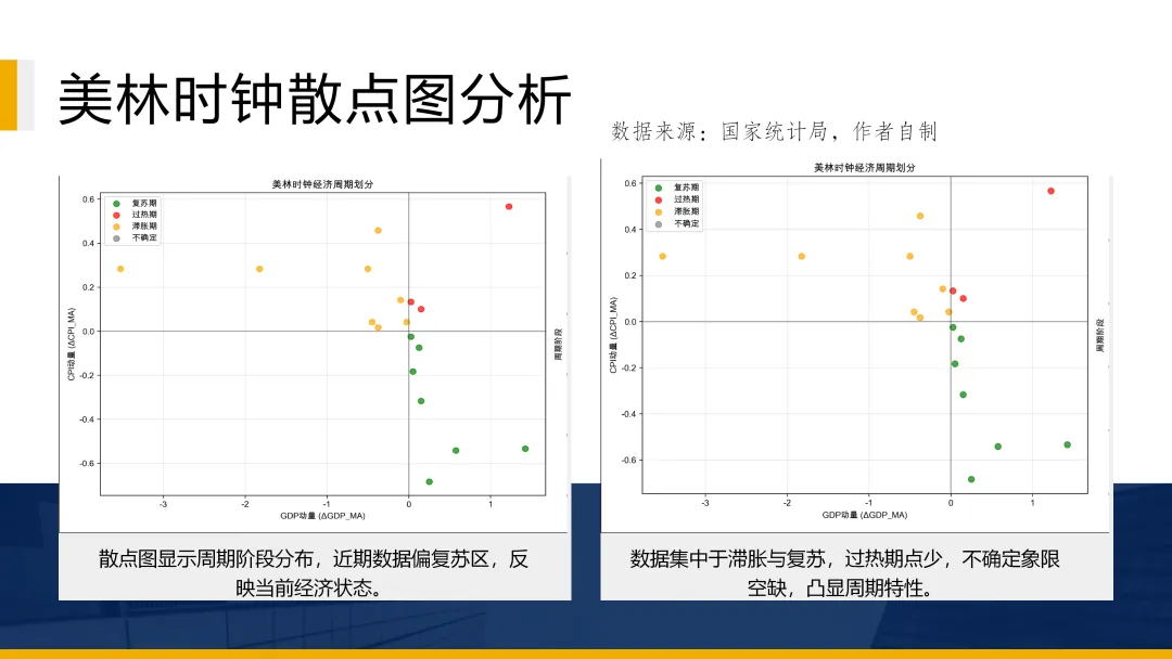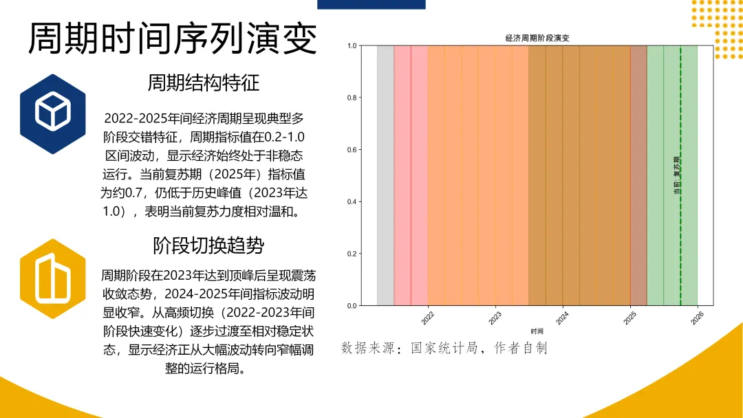 本研报源于投哪鲤联合南开大学金融学院中国公司金融研究中心、南开大学证券研究中心共同发起的宏观与产业研究活动,研报作者为林伟钦,以下为分析逻辑与结论。GDP增速自2023年起进入以5%为中心的中速平台,增长动能(AGDP_MA)整体围绕零值小幅波动,表明经济已从剧烈震荡阶段过渡至温和放缓的“新常态”。2. 经济周期形态异化,“滞胀”与“复苏”交替主导。2021-2025年周期阶段中,“滞胀期”与“复苏期”各占40%,传统“过热-衰退”轮动被打破,反映出经济在结构调整与外部冲击下增长动力不稳、价格压力间歇出现的复杂局面。
