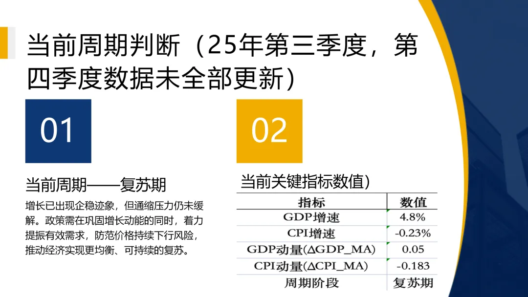 2025年第三季度数据显示,经济处于“复苏期”,但呈现“增长弱修复、价格仍低迷”特征,CPI持续负增长反映内需不足,复苏基础尚不牢固。