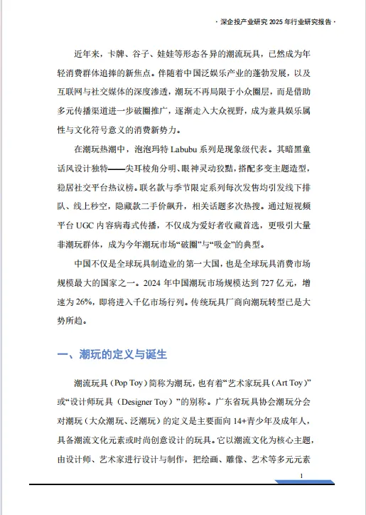 本报告聚焦 2025 年中国潮玩经济行业,系统梳理了潮玩的定义、发展历程、市场规模、产业链、品牌格局及重点细分领域等核心内容,全面呈现行业发展态势。