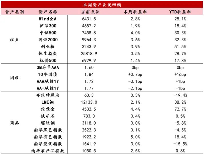 【股票】本周受地缘局势反复及美联储降息预期推动,全球贵金属和半导体板块领涨;国内方面,A500ETF冲量带动股票型ETF净流入354亿元,大盘成长流动性改善。全周A股日均成交额环比放量2000亿元至约1.97万亿元,个股中位数涨幅2.2%,两市60%以上的股票上涨,融资余额站上2.5万亿。成长风格整体表现优于价值,杠铃两端表现疲软,市场风险偏好提升。宽基指数全面走高,创业板50以4.07%的涨幅表现居前,中证500、中证1000、中证2000等中小盘成长指数周涨幅均超过3%,红利指数、万得微盘股指数微涨。行业分化依然显著,受益于全球铜、黄金、白银价格突破历史高位,叠加政策鼓励资源企业兼并重组,有色周涨超6%;商业航天板块政策及事件催化不断,国防军工涨幅6%;其余大多数行业涨跌都在1%上下;前期强劲的消费板块则出现回调。日本央行加息落地后,港股市场压力有所减轻,恒生指数上涨0.5%,恒生科技上涨0.37%。短期来看,国内政策偏重支持科技创新,存量博弈下商业航天、受流动性驱动的周期板块或将反复演绎,需警惕成交占比大幅提升后的回调风险(当前商业航天成交占比20%)。后续等待产业催化形成新的主线带动市场上攻,关注流动性改善下的春季行情。