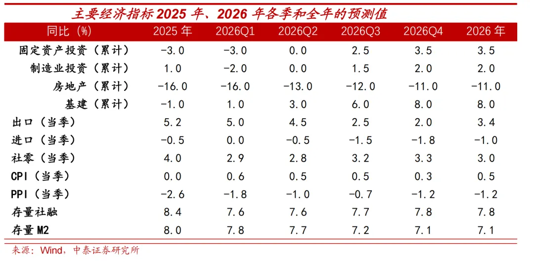 - PPI:或于年中回正。中泰证券测算:2026年PPI同比从-2.6%升至-1.2%,信达证券认为年中附近回正。但回升基础不牢 仅靠"反内卷"推动的供给侧改革难以持续,若需求端政策(基建、消费)力度不及预期,物价仍可能反复。东方金诚明确指出:"2026年整体物价水平仍将偏低,给宏观政策相机抉择、适时加力提供足够空间。"