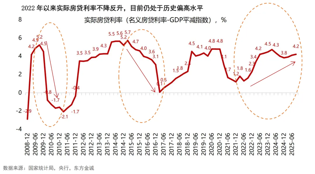 - 关键判断:实际房贷利率高达4.2%(历史高位),降息30BP仍不足以刺激地产