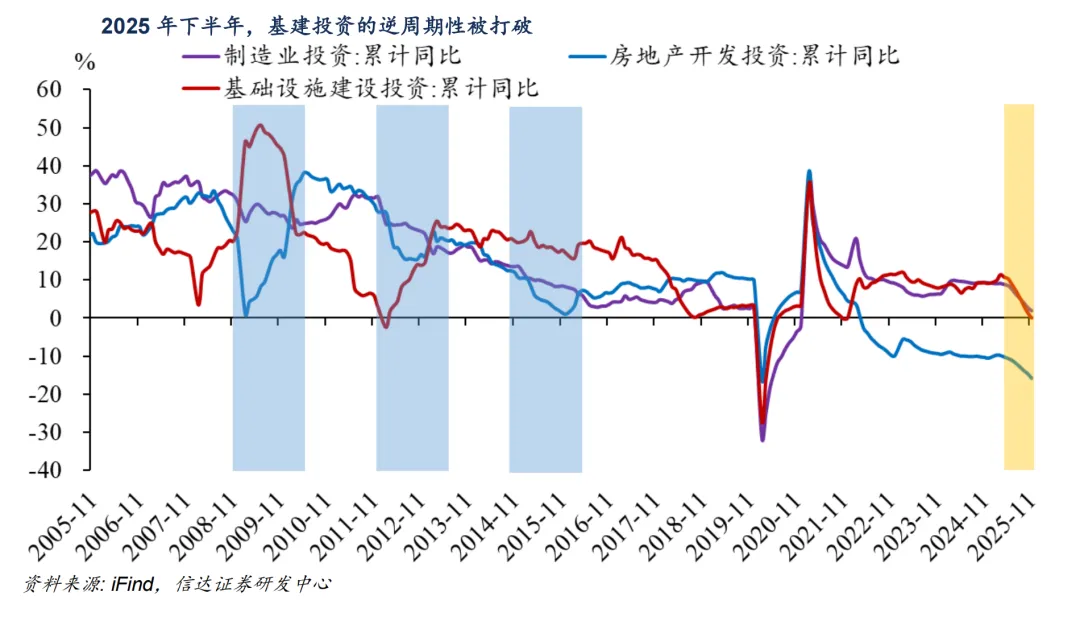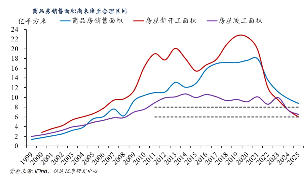 不会因短期波动而大水漫灌,托底思维贯穿全年。正如信达证券所言:"不是强刺激,而是托底。"- 地产vs基建:房地产销售继续向6-8亿平米合理区间收敛,基建投资扛起10%增长大旗。