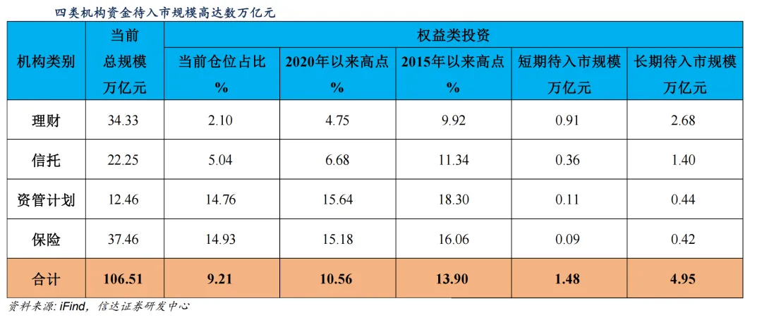- 信达证券测算:理财、信托、资管、保险四类机构资金余额106.5万亿,权益仓位仅9.21%,若提升至历史高点13.9%,待入市资金高达4.95万亿。