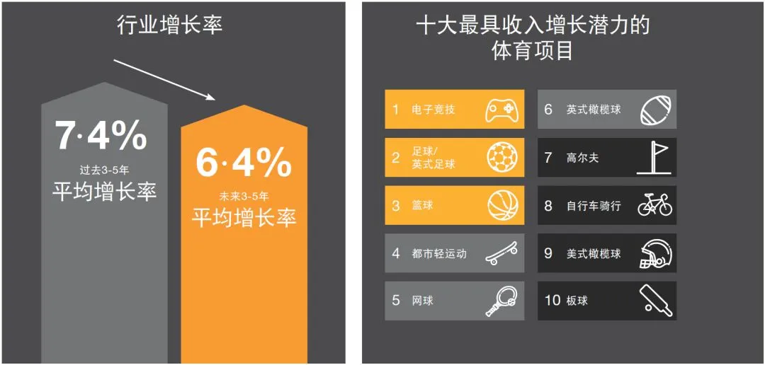 电子竞技连续第二年成为最具增长潜力的体育项目,而作为真正的全球性运动,足球和篮球显著领先于其它传统运动。都市轻运动纳入排名后立刻晋级前列,证实了运动与生活方式之间的融合日益紧密。