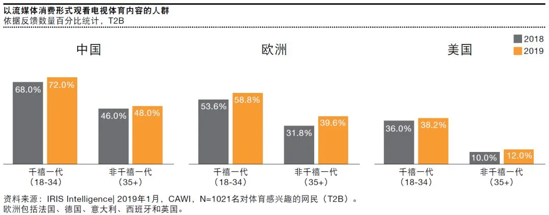 数字化无疑是体育消费的未来,体育内容的在线流媒体在过去一年中持续增长了2-8个百分点,但通过数字频道观看体育比赛的美国消费者所占的比例相对较小,中国千禧一代显然更愿意拥抱流媒体。