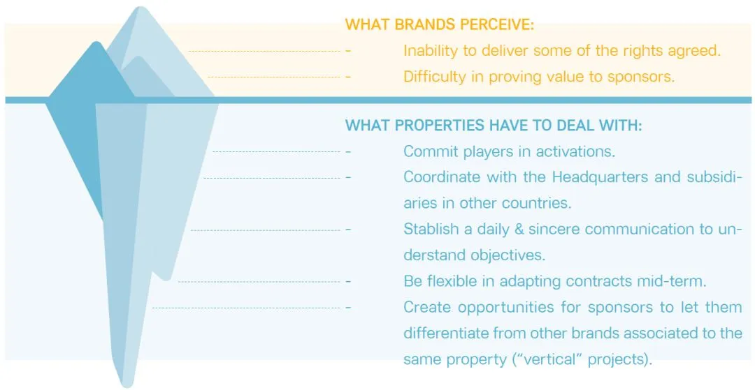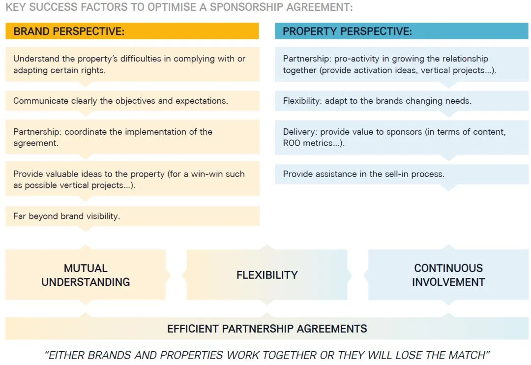 1、理解赞助方的目标不只是获得曝光和品牌认知度,而是为了提升商品或服务的销售量。被赞助方应该主动帮助赞助方实现目标。2、建立与赞助方分层级的交流方式,避免直接联系CEO,形成高效的沟通机制。3、建立与表现挂钩的赞助付费模式,向赞助方显示自己实现目标的意愿和决心。赞助费既可以和球队的赛场表现挂钩(赢得比赛、联赛排名等),也可以是其它方面取得的成绩(门票销售、上座率、某个特定市场的品牌商品销售量等)。编译:李晨曦,校改:Horry