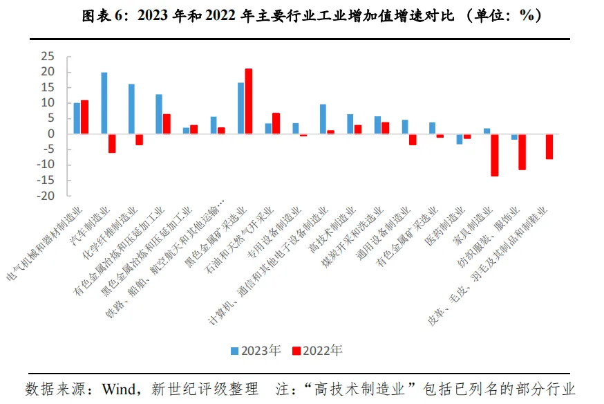 2023年我国工业产业结构继续优化,新能源领域产量仍保持高速增长,新能源汽车产量同比增长30.3%,太阳能电池增长54.0%,风力和太阳能发电量分别增长12.3%和17.2%,增速均显著高于工业整体。但高技术制造业出现放缓,增加值同比2.7%,慢于工业整体且较上年降低4.7个百分点。背后原因,一是疫情防控平稳转段后,疫苗、口罩等防疫用品需求下滑,前11月医药制造业工业增加值同比下降6.0%;二是全球半导体下行周期对电子及通信设备制造业,计算机及办公设备制造业等造成较大拖累,从历史经验看,高技术制造业增加值增速与全球半导体销售额增速相关度较高,而后者在上半年跌幅较大。