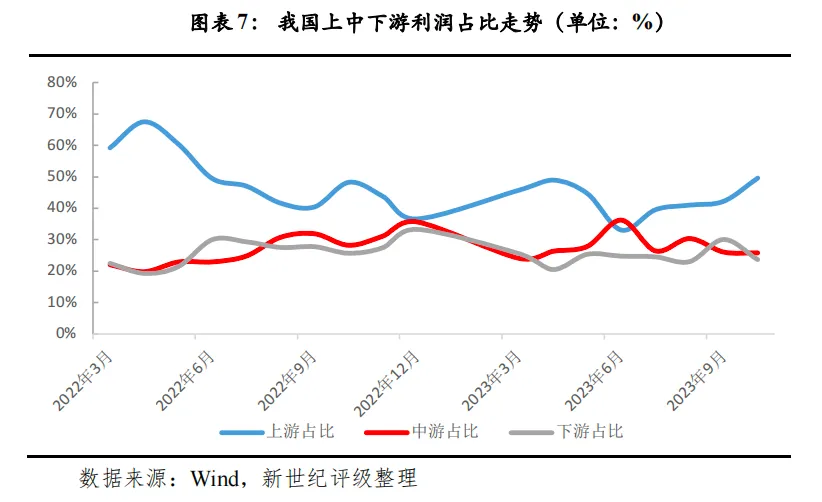 2023年我国工业企业经营绩效不佳。前11月规模以上工业企业营收同比1.0%,营业利润同比-4.4%,分别较2022年下降4.9和0.4个百分点。随着PPI于年中触底回升,工业企业盈利在下半年已呈现修复态势。41个工业行业中,有18个行业利润总额同比增长,增长面为43.9%。从上中下游看,下游利润占比总体保持平稳,但上游和中游利润占比波动较大,主要是上半年原材料价格同比降幅持续扩大,导致上游利润占比回落,利润空间整体向中游倾斜;下半年的逻辑则与此相反。主要行业中,受煤炭和石油价格回落影响,煤炭开采和洗选业、石油和天然气开采业利润同比分别下降26.3%、10.3%;同时,与其关联度较高的下游企业因此获益,如电力热力生产和供应业利润同比上涨62.6%、化学纤维制造业同比上涨17.9%、橡胶和塑料制品业同比上涨16.1%。此外,化学原料和化学制品制造业、计算机通信和其他电子设备制造业利润表现较差,前11月分别下降38.6%、11.0%。