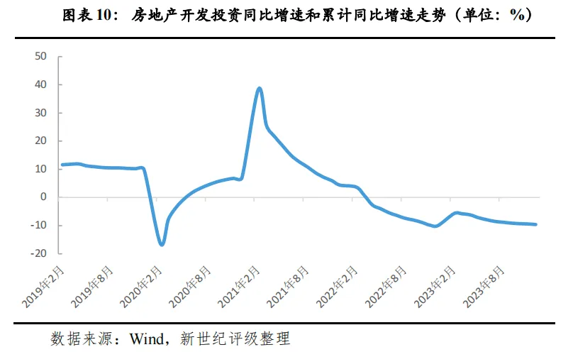 始于2021年下半年的房地产下行态势仍在继续。2023年,房地产开发投资同比下降9.6%,降幅较上年仅收窄0.4个百分点。从需求侧看,尽管年内国家和地方层面均对楼市支持政策进行优化,但较高的居民部门杠杆率和转弱的预期使得居民加杠杆意愿弱化,同时,国内多数城市房价持续调整,居民逐渐产生房价下跌预期,“买涨不买跌”心理抑制了部分购房需求。2023年,全国商品房销售面积为11.17亿平方米,较2022年下降17.8%,较2021年下降37.7%。从供给侧来看,由于房企销售回款不佳,且部分民营房企信用风险仍较高,再融资渠道不畅,到位资金同比下降13.6%,导致房企新开工和拿地规模大幅收缩:2023年全国房屋新开工面积9.54亿平方米,较2022年下降20.9%,较2021年下降52.0%;100大中城市成交土地占用面积9.16亿平方米,较2022年下降21.8%,较2021年下降26.4%。
