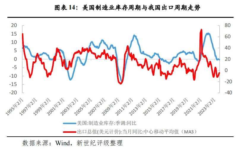 以周期的视角看,我国外需压力最大的阶段或已过去。首先,美国通胀水平已持续回落,美联储在2023年最后一次议息会议上暗示本轮加息周期已基本结束,且2024年或有3次降息,届时高利率对全球经济活动的抑制将逐渐弱化,全球贸易动能有望提升。据IMF(国际货币基金组织)于2023年11月发布的最新预测显示,2024年全球商品与服务贸易额增长率为3.5%,较2023年高出2.6个百分点。其次,本轮美国制造业去库周期已接近尾声,2024年有望开启新一轮的补库进程,而从历史经验看,我国出口与美国制造业库存周期关联度较高,其补库周期往往对应我国出口上行周期。最后,随着PPI步入上行周期,我国出口价格也将迎来一定支撑。