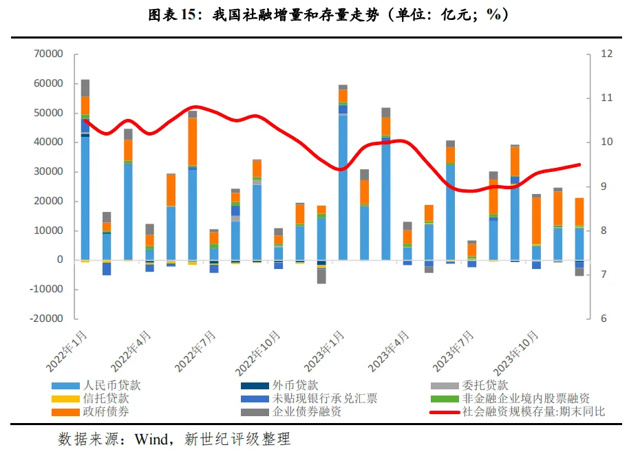 从结构来看,人民币贷款、政府债是新增社融的主要贡献项。2023年,我国新增人民币贷款22.2万亿元,同比多增1.3万亿元;新增政府债券净融资8.67万亿元,同比多增2.5万亿元。企业债、委托贷款是新增社融的主要拖累项,新增企业债券净融资1.6万亿元,同比少增0.43万亿元;新增委托贷款199亿元,同比少增3381亿元。