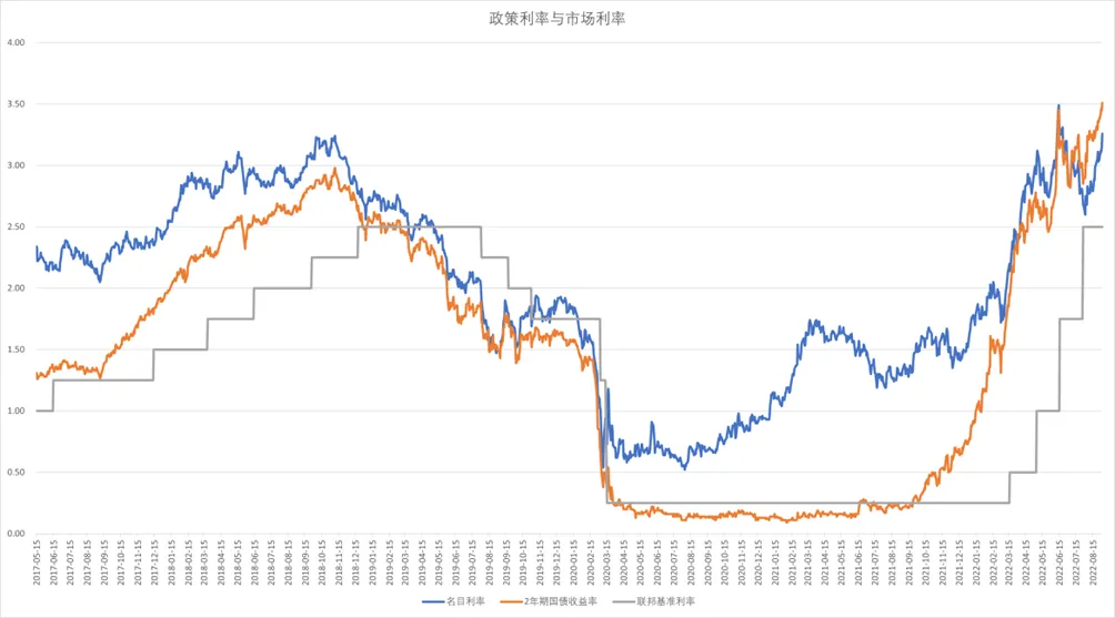 [1]橙色线为美国2年期国债收益率(市场预估的政策利率);蓝色线为美国10年期国债收益率(市场面对的名目利率);灰色线为美联储的联邦基金利率