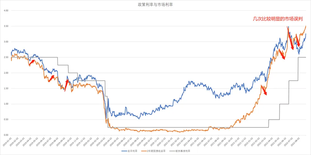 从图1-1当中我们可以看到,美联储的前瞻指引在大多数情况下是有效的,长期来看美国国债的收益率都会向着美联储预期的方向进行变动。但由于市场和美联储间存在信息差异,市场与美联储的有时会发生短期博弈,并在博弈过程中对政策产生比较明显的误判。