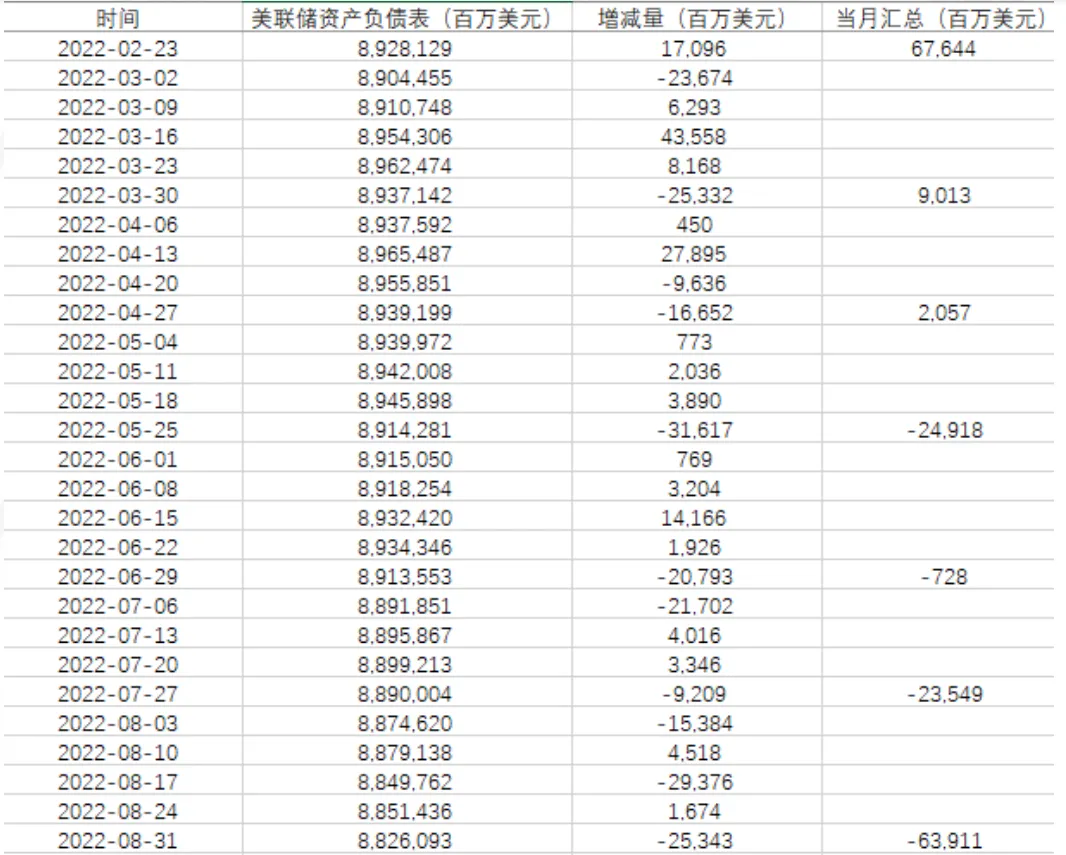 时间维度:2017年5月15日至2022年9月1日[2]https://fred.stlouisfed.org/series/WALCL[3]https://sc.macromicro.me/collections/51/us-treasury-bond/4458/us-treasury-issuance-gross[4]https://zh.tradingeconomics.com/united-states/government-debt-to-gdp[5]https://zh.tradingeconomics.com/united-states/money-supply-m2[6]https://zh.tradingeconomics.com/united-states/money-supply-m1[7]https://data.worldbank.org.cn/indicator/NE.TRD.GNFS.ZS?end=2021&start=1960[8]https://cn.investing.com/indices/baltic-dry[9]https://zh.tradingeconomics.com/united-states/energy-inflation[10]https://zh.tradingeconomics.com/united-states/services-inflation[11]https://zh.tradingeconomics.com/united-states/rent-inflation[12]https://zh.tradingeconomics.com/united-states/food-inflationl[13]https://zh.tradingeconomics.com/united-states/retail-sales-annual[14]https://zh.tradingeconomics.com/united-states/retail-sales-annual[15]https://fred.stlouisfed.org/series/STICKCPIM157SFRBATL[16]https://fred.stlouisfed.org/series/CES0500000003[17]https://zh.tradingeconomics.com/united-states/inflation-cpi[18]https://fred.stlouisfed.org/series/T10Y2Y
