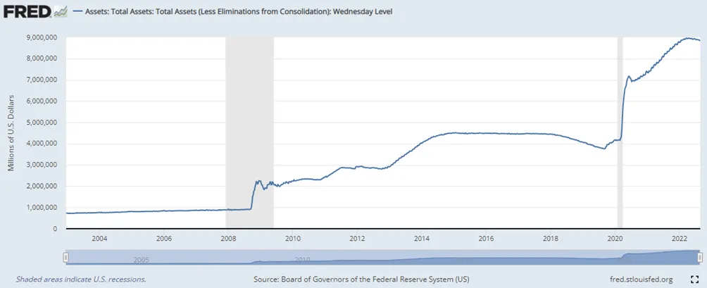 2020年初,美国的景气下行叠加了新冠疫情,造成了大规模的美元流动性危机,因此美联储采取了“零利率+无限制QE”这样前所未有的措施来试图挽回市场信心,在这个过程中美联储的资产负债表从4.1万亿左右倍增到最高点的8.9万亿,向市场投放了天量的流动性。