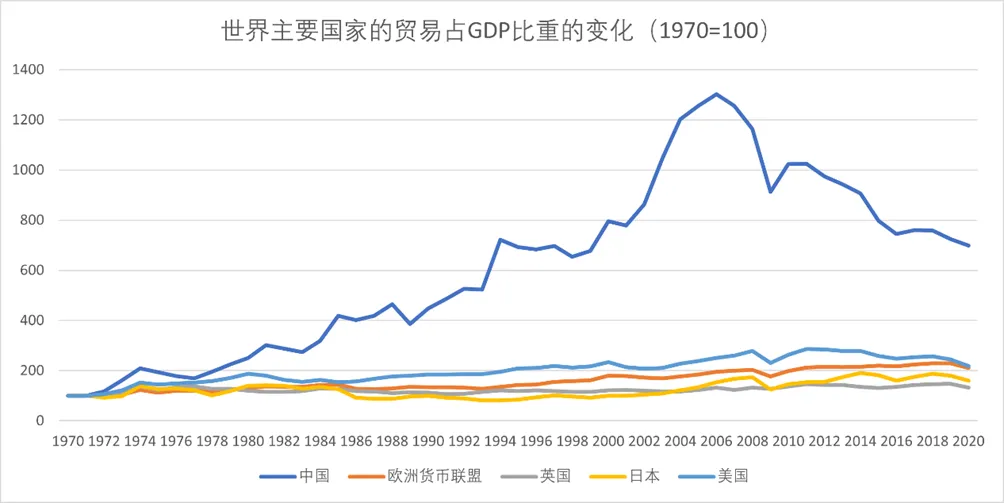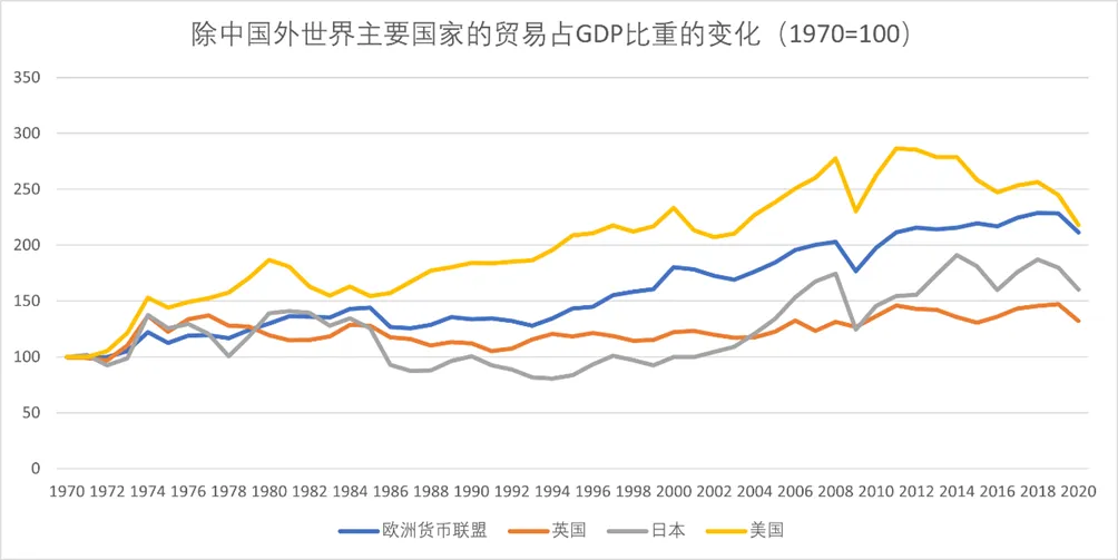 图2-8 除中国外世界主要经济体的贸易依存度(1970=100)