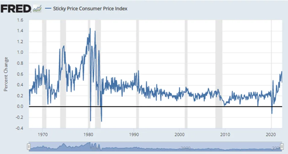 粘性价格消费者价格指数 (CPI) 是根据 CPI 中包含的相对不经常改变价格的商品和服务的子集计算得出的。由于这些商品和服务的价格变化相对较少,因此人们认为它们比变化更频繁的价格更能体现对未来通胀的预期。粘性价格的一种可能解释可能是公司在改变价格时产生的成本。粘性价格指数的上升意味着通胀本身会变得越发顽固。